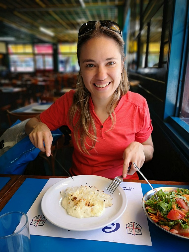 Un po’ delusi, abbiamo fatto visita al ristorante Banchero, stabilito negli anni Trenta ed a detta sua inventore della “Fugazza al formaggio” … Noi genovesi intendiamo qualcosa di diverso quando parliamo di “focaccia al formaggio” (vedi il contrasto nella foto sotto) ma tuttavia questa nuova versione alta, con tonnellate di formaggio, cipolle e olive non era affatto male, come testimoniato dal mio grande sorriso! 😋