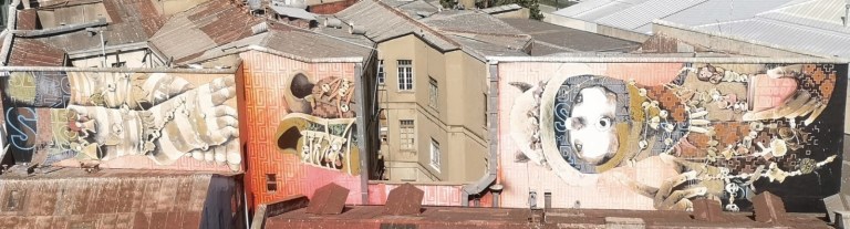 Nascosto tra le case colorate e distribuito su più edifici, si può anche scovare un enorme graffiti di Inti Castro. Per coloro che non lo conoscono, Inti Castro è un muralista e graffitista nato nella città di Valparaiso ma famoso in tutto il mondo per le sue opere. Dipinge tipicamente su larga scala ed è riconosciuto per i suoi personaggi ispirati al sincretismo latinoamericano (mix tra il patrimonio spagnolo e quello indigeno)