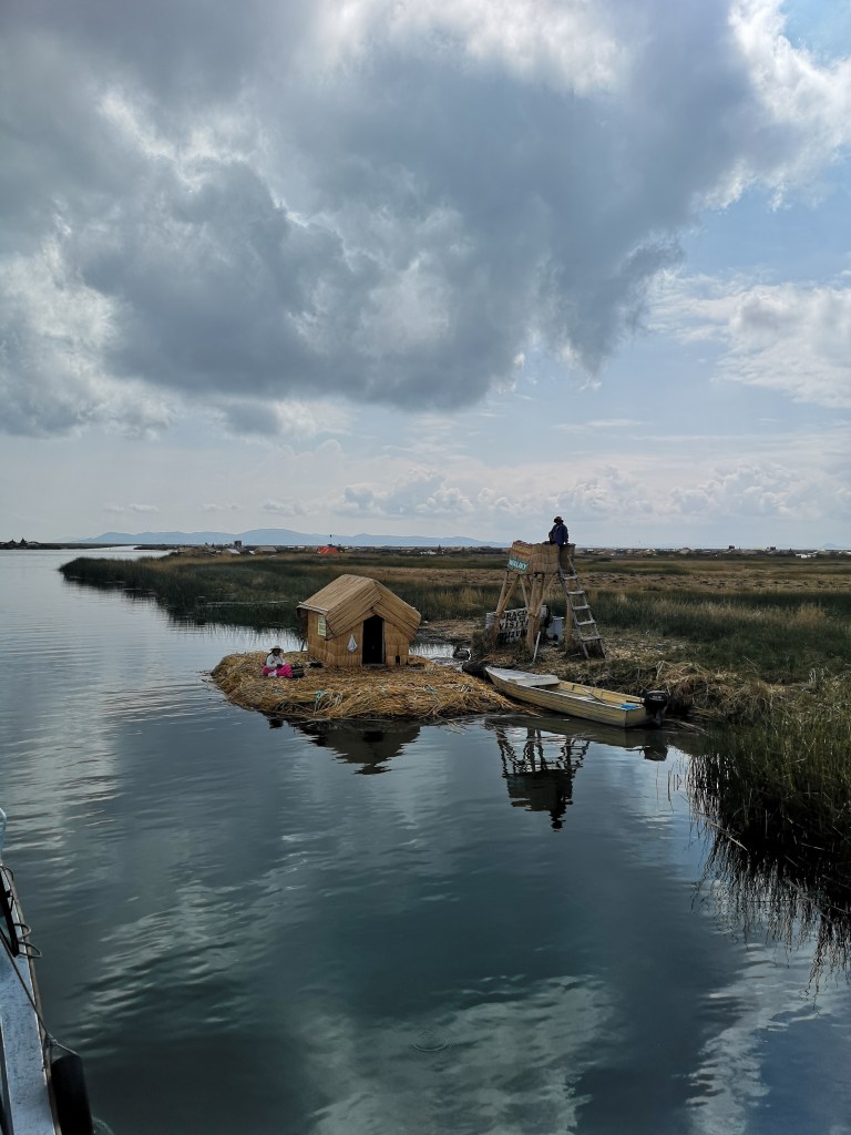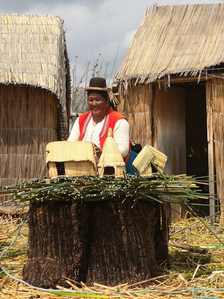 All’arrivo su una delle isole veniamo accolti da un’ abitante che spiega che un’isola galleggiante è costituita dalle fitte radici delle canne di totora – queste si intrecciano per formare uno strato naturale di uno o due metri di spessore che sostiene le isole. Le isole sono quindi ancorate con funi attaccate a bastoni condotti sul fondo del lago. Gli strati inferiori dell’isola marciscono abbastanza velocemente, quindi nuovi strati vengono aggiunte in superficie ogni tre mesi circa; un’isola impiega c. 1 anno per essere costruita e può durare circa trenta anni.