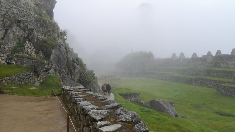 Scendendo, troviamo Machu Picchu nella nebbia, non una brutta vista ma non così impressionante come immaginavamo.
