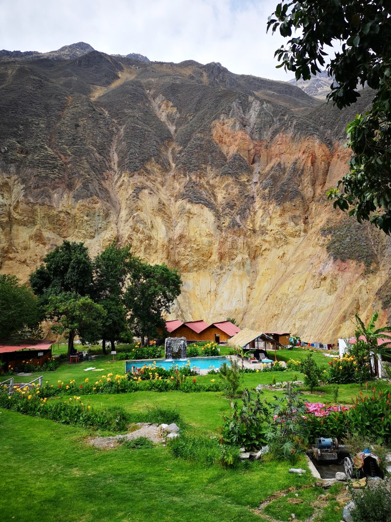 A Llahuar ci sono 2 ostelli (e nient’altro oltre a quello). Ne abbiamo scelto uno e ci siamo preparati per le piscine termali !!!! A causa del maltempo (ha piovuto solo un po’ alla fine) eravamo soli nelle piscine che ci siamo goduti in solitudine 😎
