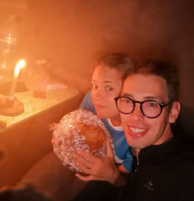 Dopo una cena semplice preparata dall’ostello, ci siamo concessi un panettone nella nostra stanza a lume di candela