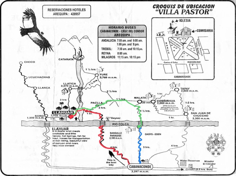 Giorno 1 (rosso): escursione in discesa di 1300 metri da Cabanaconde a Llahuar. Ci viene detto di iniziare presto perché siamo nella stagione delle piogge, quando di solito è bel tempo al mattino e piove nel pomeriggio … Quindi ci impegniamo in una bella discesa (particolarmente piacevole per le nostre ginocchia anziane) – l’aria è molto secca; aria calda profumata che ricorda la sauna si alterna a brezza fresca. Attraversiamo ponti moderni e meno moderni, e con tuoni sullo sfondo, arriviamo finalmente a Llahuar, con l’intenzione di allestire la nostra tenda. Non avevamo considerato l’abbondanza di piccole zanzare però, che ci ha fatto subito cambiare idea, quindi decidiamo di prendere una stanza dell’ostello!
