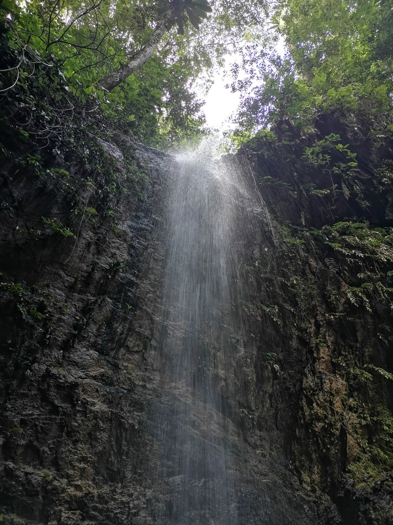 Dopo un po’ di camminata arriviamo alla cascata. Dove facciamo una doccia (scusate, abbiamo foto non troppo lusinghiere di noi sotto la cascata, accontentatevi della cascata senza di noi!)